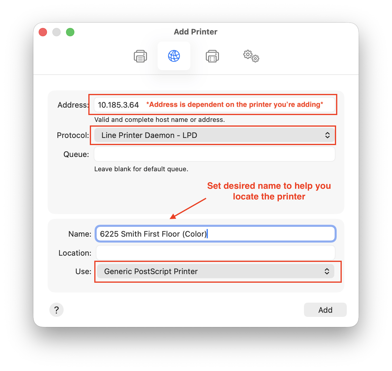 Address: 10.185.3.64 (or the IP address of the printer you are trying to add)